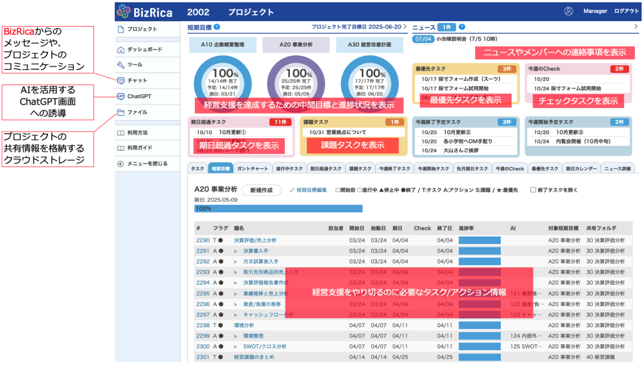 ダッシュボードを見るだけで、経営支援プロジェクトの進捗状況を確認でき、今やるべき業務がわかります